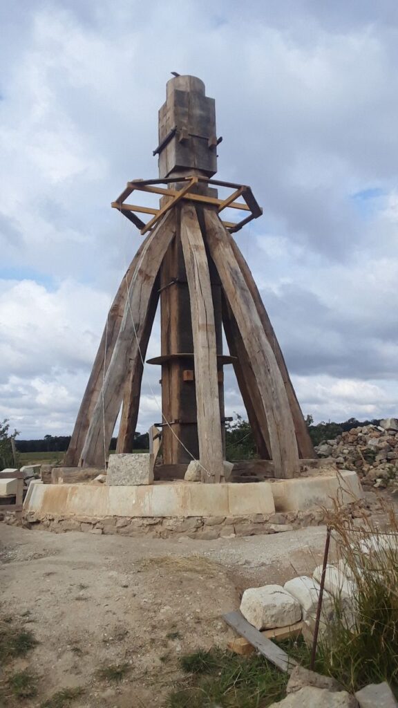 A partir des vestiges et pour conserver une trace des bois d’origine nous étant parvenus, les bois les remplaçant ont été spécifiquement sélectionnés en forêt pour en restituer les courbes. Pour le pivot, les bois ont été équarris à la hache puis sciés de long pour la huse.