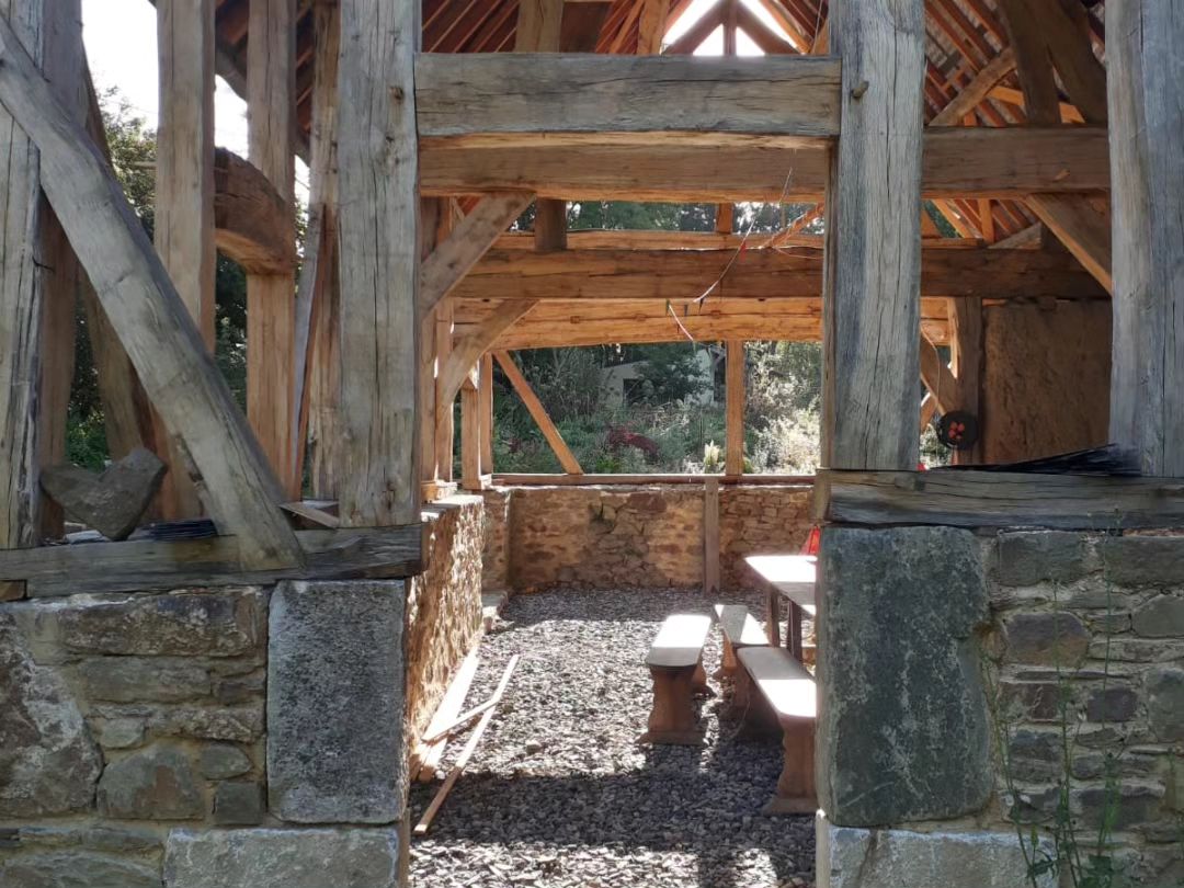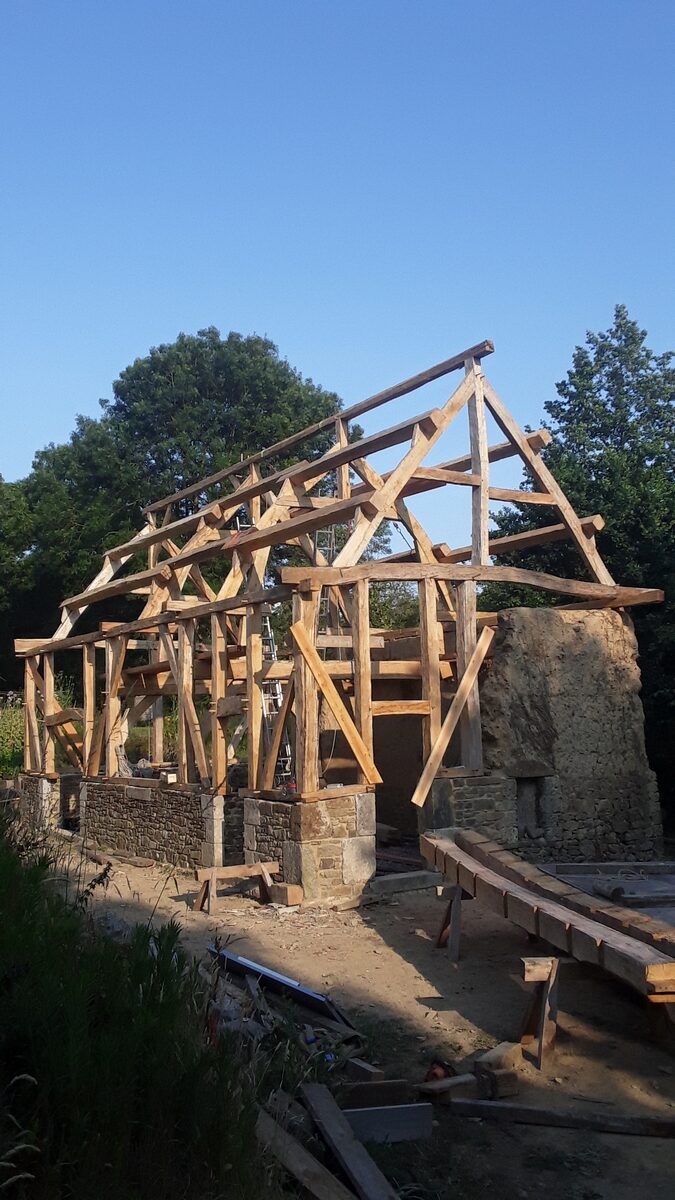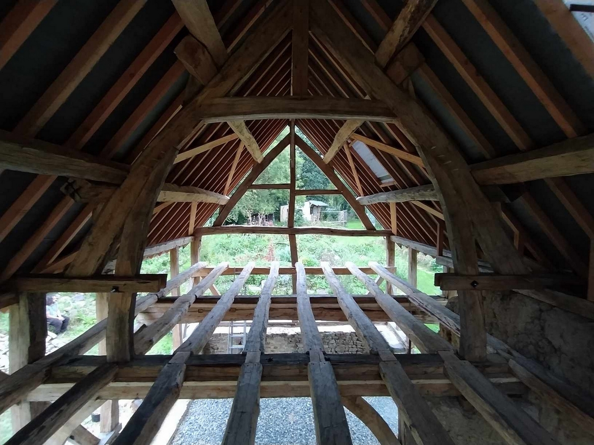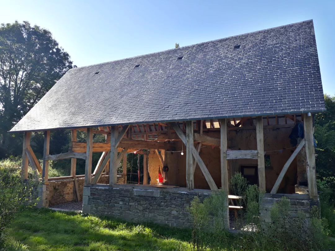 Structure poteau poutre et charpente en chêne sur les vestiges d’une dépendance en « masse » d’un ancien moulin à eau.