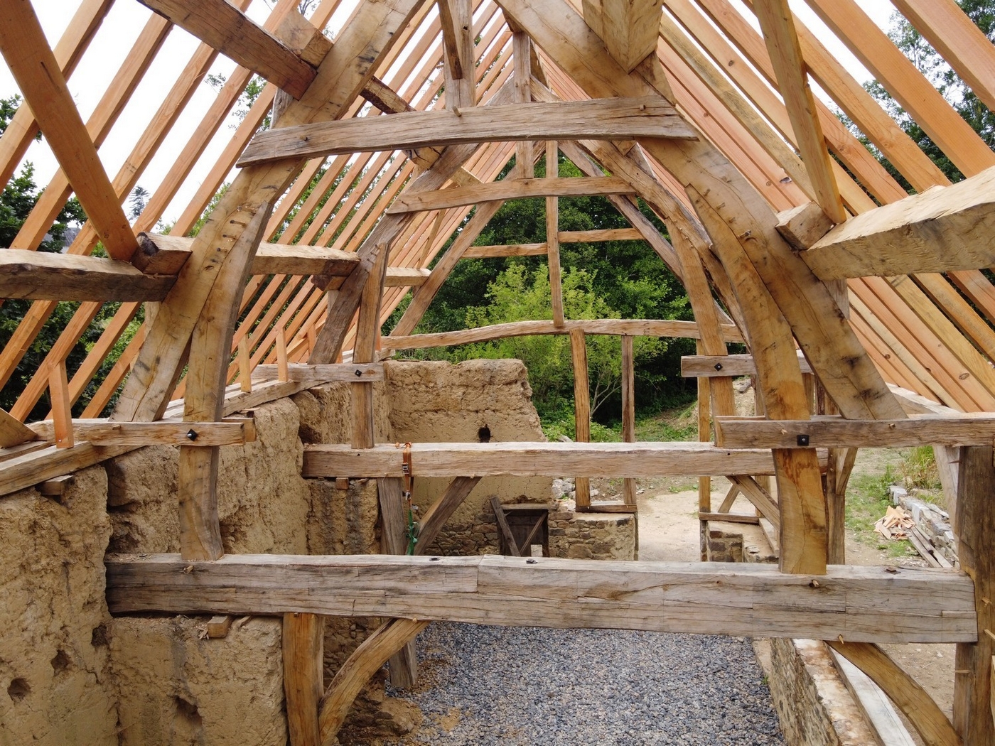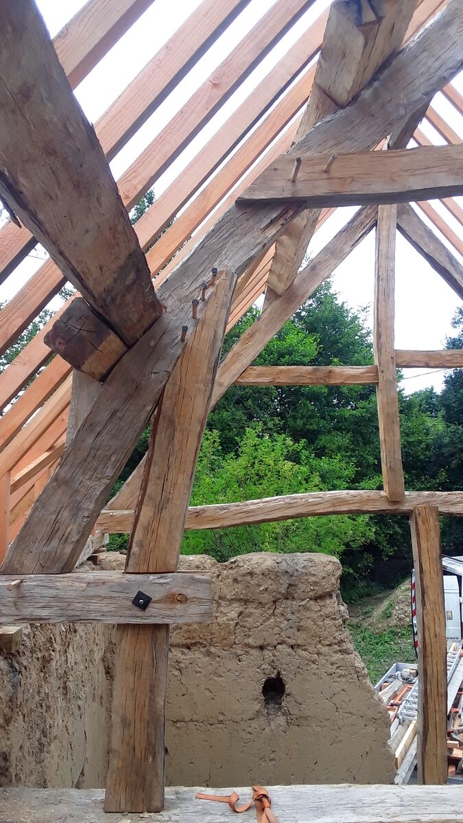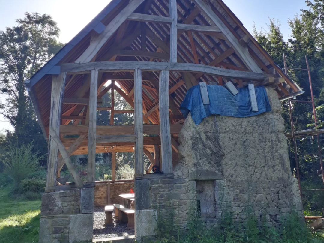 Structure poteau poutre et charpente en chêne sur les vestiges d’une dépendance en « masse » d’un ancien moulin à eau.