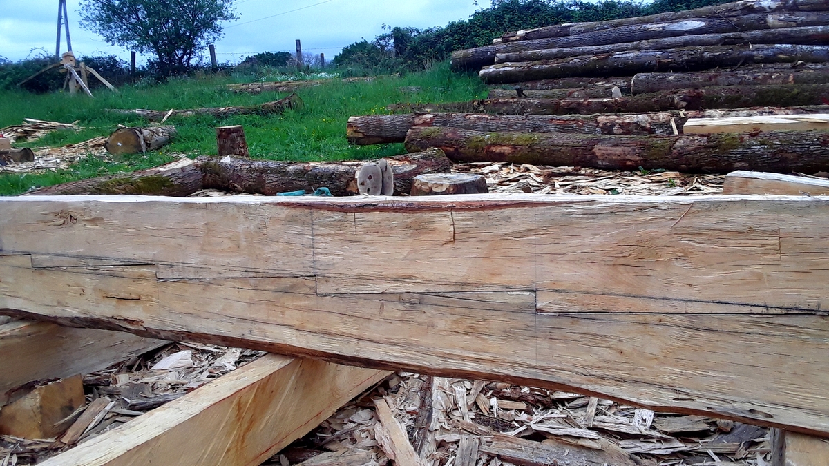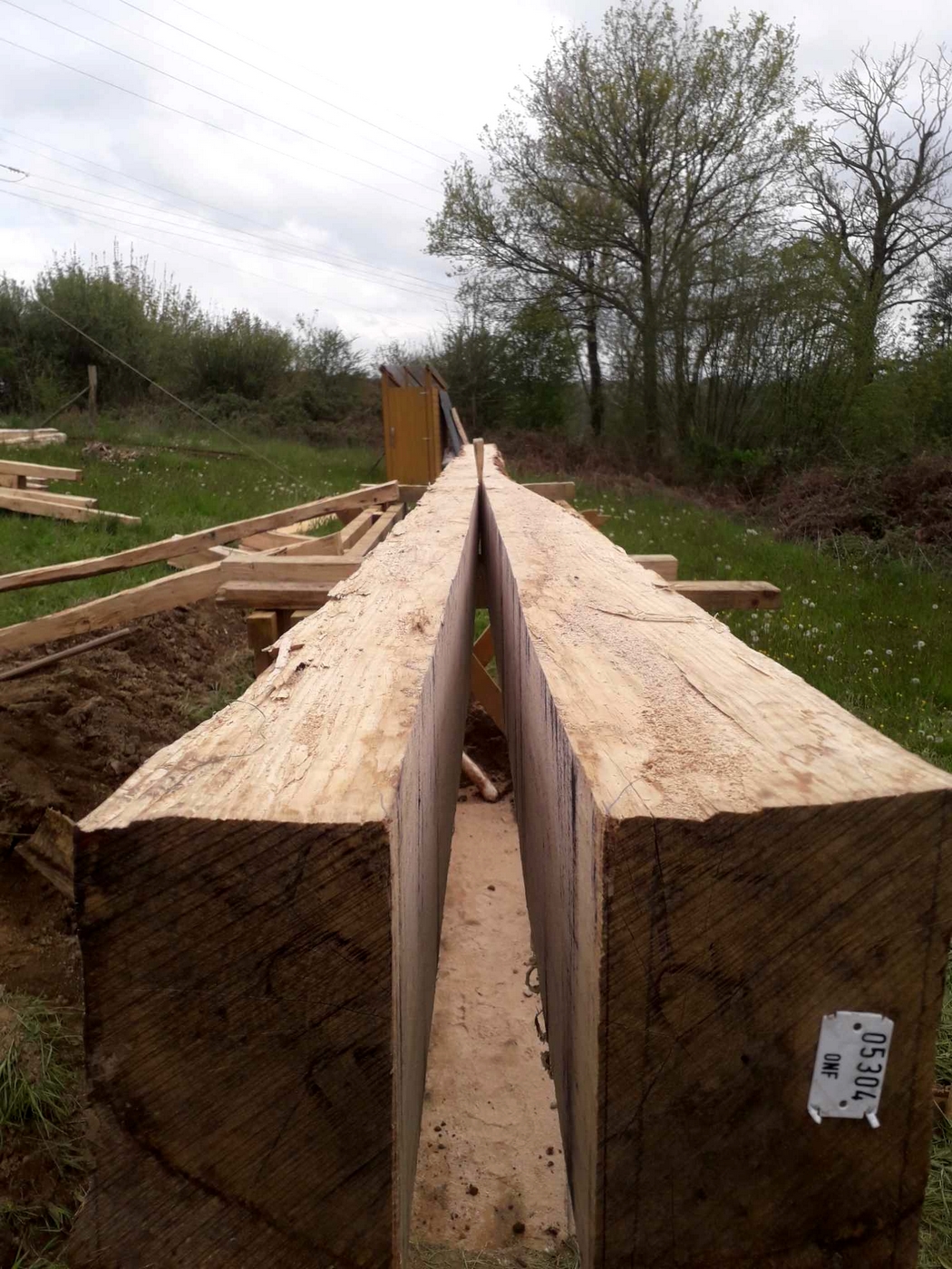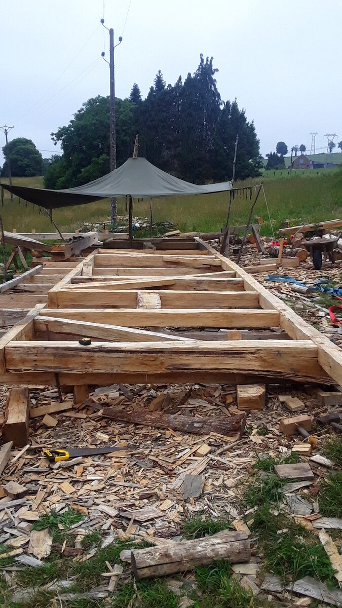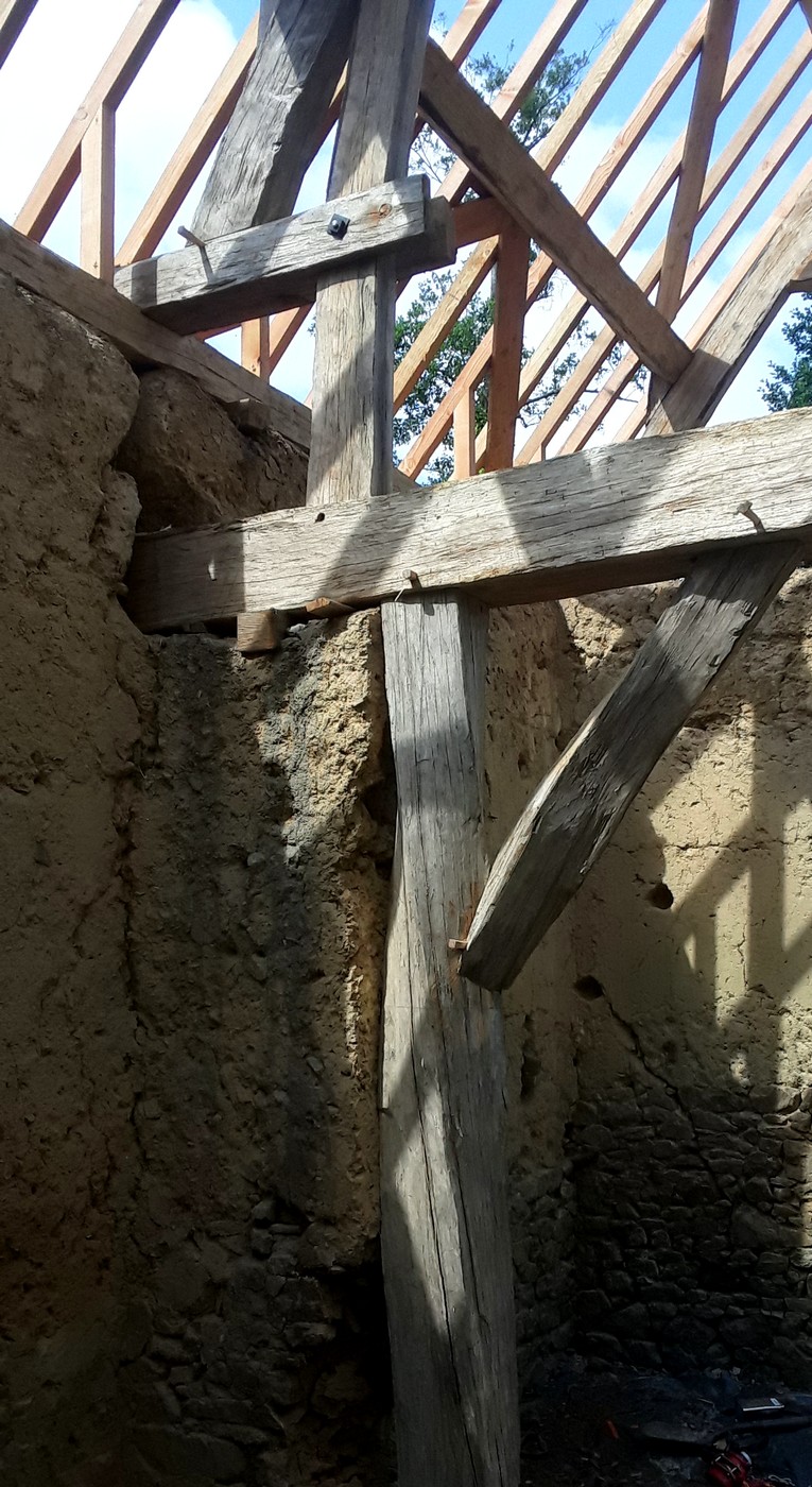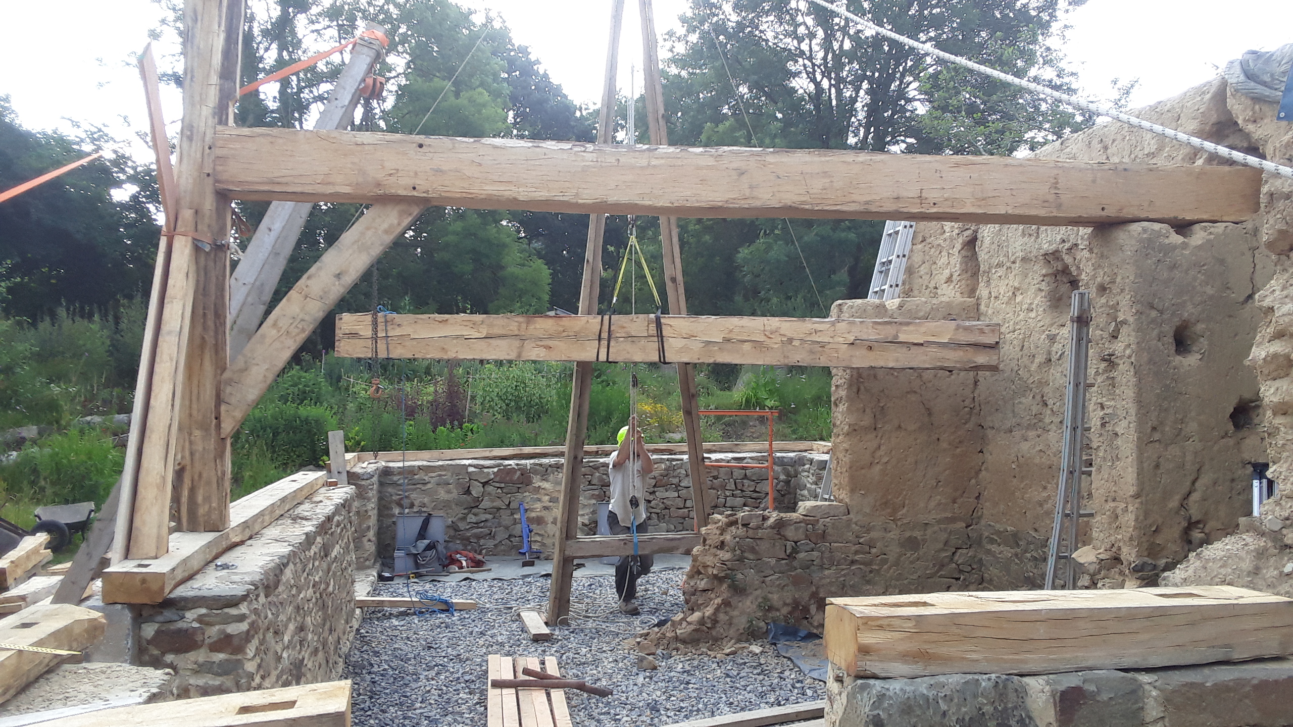 Premier chantier intégralement taillé sans outils mécanisés. Levage à la corde et chèvre. Remplissage des murs en terre crue à venir.